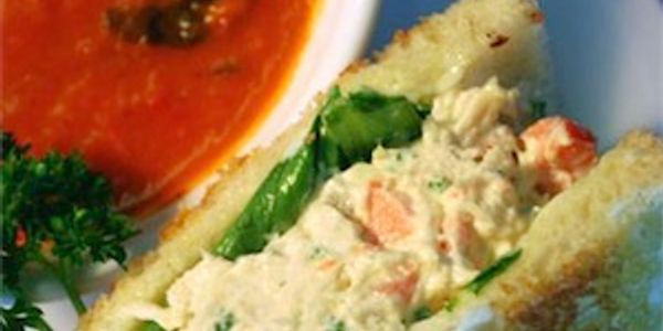 Our crab salad served with lettuce and tomato on grilled sourdough bread topped with melted Havarti cheese and ripe avocado.