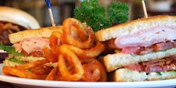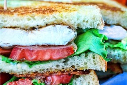 A triple-decker delight! Sliced smoked turkey, ham, bacon, tomato, lettuce and mayo on grilled sourdough.